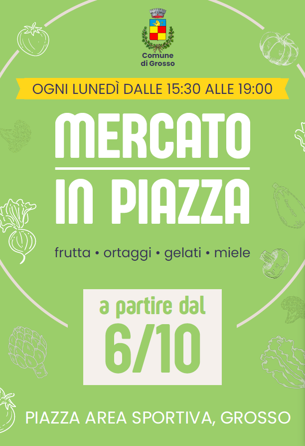 Da lunedì 6 ottobre, in via sperimentale, parte il Mercato in Piazza, presso il piazzale dell'Area Sportiva.